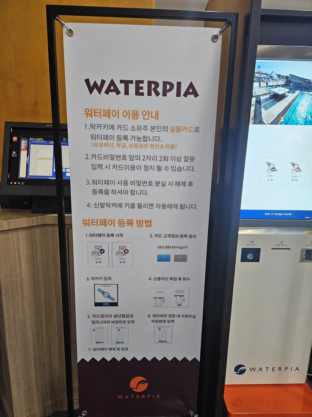 깜빡하고 물놀이용품을 안가져오신분들은 1층에서 구매가 가능하고 워터피아 내에서 음식을 사 먹을 경우 삼성페이를 이용하시거나 아래 사진에서처럼 워터페이를 등록해서 사용하시면 됩니다.