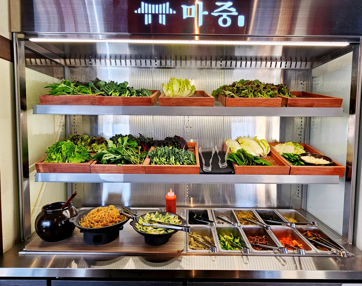 12가지 다양하고 건강한 반찬에 싱싱한 쌈채소와 보리된장까지, 기본 상차림에 나오는 모든 음식이 셀프바에 있기 때문에 부담 없이 가져다 먹을 수 있었고 식기류도 깨끗하게 정돈되어 필요한 만큼 더 이용할 수 있었어요.